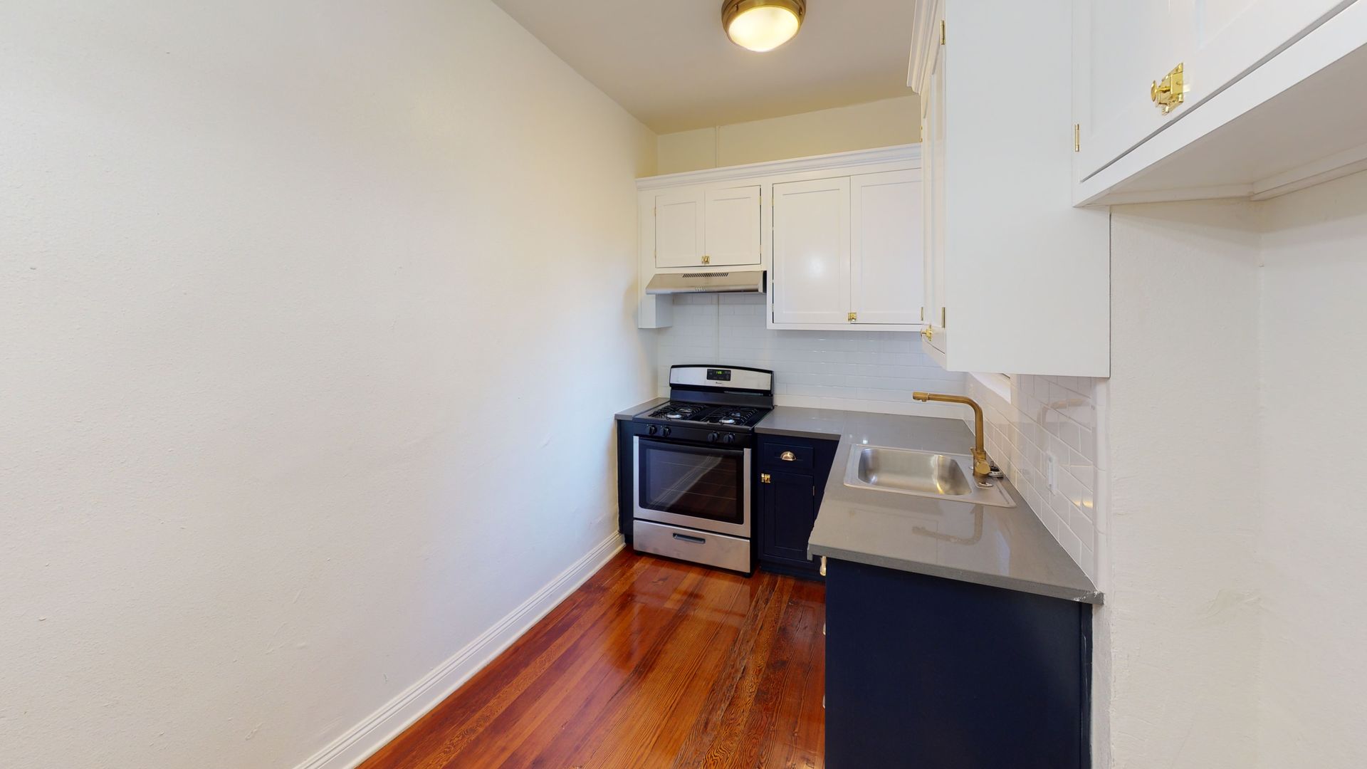 Interior Amenities: Newly remodeled, all new design brass light fixtures and faucets, tile in bathroom, subway-tile shower enclosure, custom made cabinets with quartz counter tops, subway-tiles backsplash and stainless steel appliances.